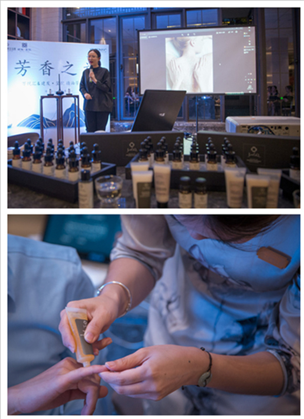精油的淡雅清香讓人仿佛置身于花田之間,清甜芳香里夾雜著檸檬香調(diào),牢牢地抓住了盛夏清新的精髓。在現(xiàn)場(chǎng),從泰國(guó)遠(yuǎn)道而來(lái)的精油講師為來(lái)賓慢品精油的味道、功能和使用方式。茉莉精油可以提振精神、改善皮膚過(guò)油、缺水或敏感的情況,玫瑰能改善皮膚干燥恢復(fù)皮膚彈性并促進(jìn)黑色素分解,柑橘精油含有豐富的維生素C,與橙花和薰衣草精油混搭可以淡化疤痕……每一種都有屬于自己的獨(dú)特“性格”。