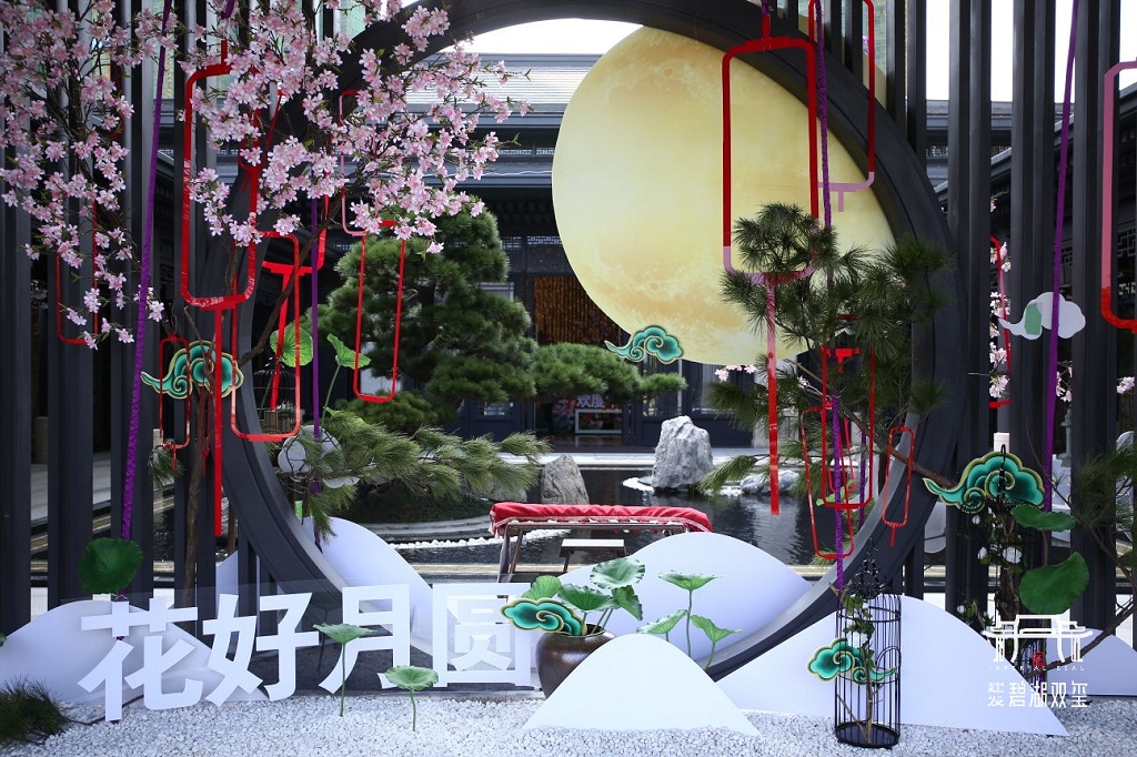 古樸雅致的“花好月圓”入口堆陳、琳瑯滿目的連廊花燈,陳陳箏音在古香古色的碧湖雙璽售樓部悠揚回蕩,余音繚繞,仿佛置身古時的賞燈花節(jié)。靈動仙氣的嫦娥使者在門口歡快地迎接每一位嘉賓。新中式古典奢雅的復(fù)古美陳,玉盤珍饈和精致花藝的唯美搭配,從細節(jié)處重現(xiàn)極致的東方神韻,一場奇幻美妙的東方穿越之旅從此開啟。