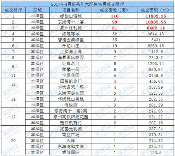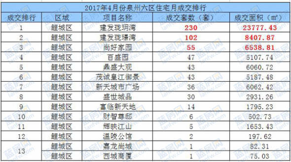 2017年4月份泉州六區住宅月成交排行前二十樓盤