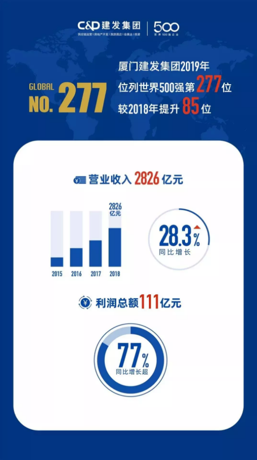 北京時間7月22日,《財富》雜志發(fā)布2019世界500強(qiáng)榜單,建發(fā)集團(tuán)躍居第277位,較2018年上升85位。排名背后,是不斷提升的運(yùn)營效率和經(jīng)營質(zhì)量。2018年,建發(fā)集團(tuán)實現(xiàn)營業(yè)收入2826億元,同比增長28.3%;利潤總額111億元,同比增長超過77%。