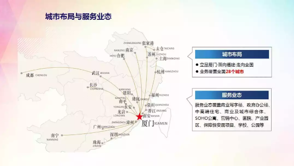 建發物業始于1995年,系建發房產旗下專業從事物業管理的集團公司,遵循“立足廈門、面向福建、輻射全國”的發展戰略,建發物業的項目版圖不斷擴大,所轄區域輻射28個城市,在管項目逾178個,管理面積近3000萬平方米,服務類型覆蓋寫字樓/辦公樓、住宅、城市綜合體、商業、醫院、產業園區、學校、公園等公共配套項目,提供物業前期介入、物業顧問服務、物業全委管理、物業資產管理、物業增值服務等物業項目全生命周期服務。