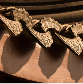大門(mén)兩側(cè),放置門(mén)當(dāng)。圓形為武官,象征戰(zhàn)鼓;方形為文官,象征硯臺(tái)。門(mén)楣戶(hù)對(duì),成對(duì)突出,純圓柱為文官,六邊柱為武官。每逢喜慶可懸掛燈籠,寓意人丁興旺、香火永續(xù)。