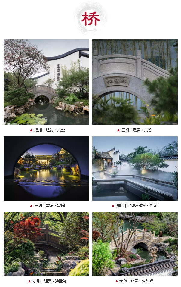 唐代,人們?cè)阱睒蛏显O(shè)立驛站,凡送別親人好友東去,大多都要送到灞橋后才分手,并折下岸邊柳枝相贈(zèng)。建發(fā)房產(chǎn)的中式產(chǎn)品,廣泛運(yùn)用了拱橋、折橋等形式。太倉(cāng)泱著的橋,展現(xiàn)了小橋流水、蜿蜒曲折的江南建筑美感。