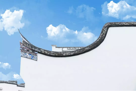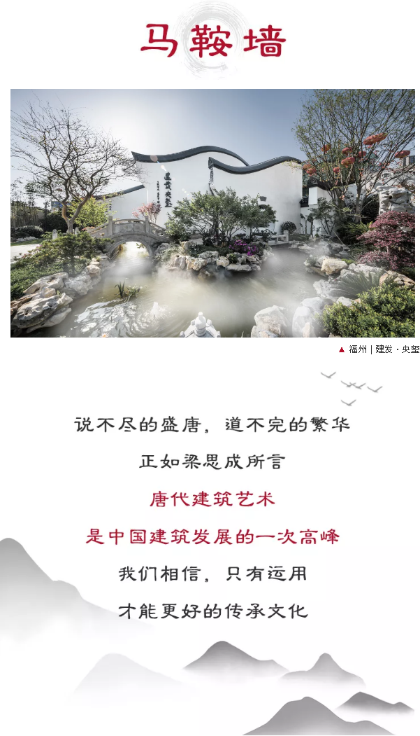 福州央璽的馬鞍墻,墻體形成馬鞍狀流線(xiàn),墻頭瓦片累疊,脊頂青灰抹平,造型豐富,自由舒展。