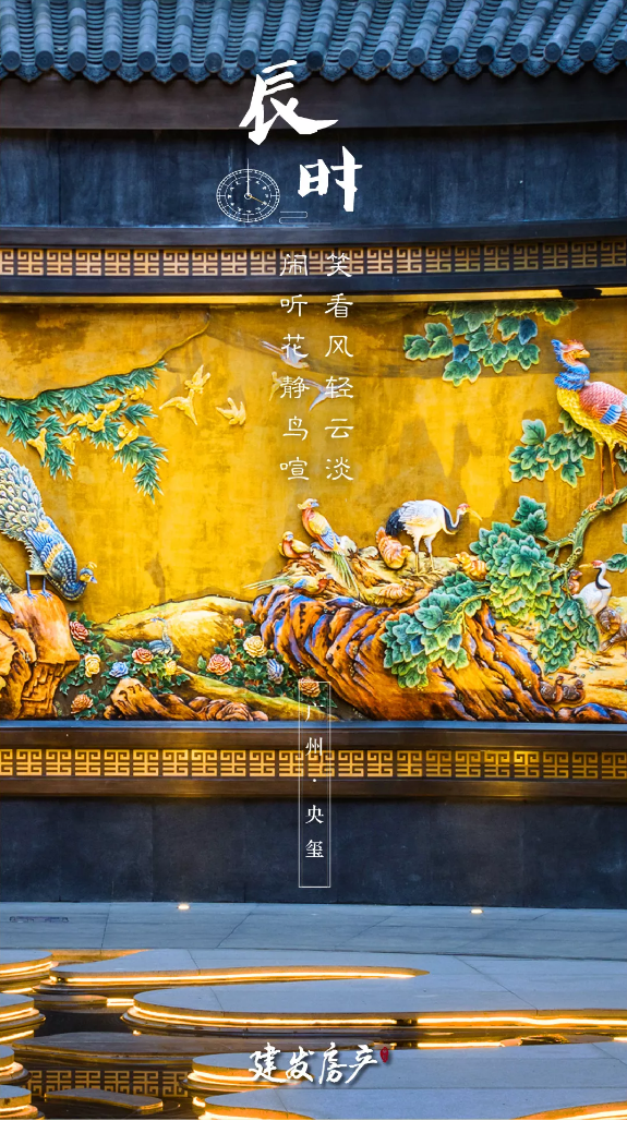 唐時(shí),照壁之美就已驚艷世人,詩(shī)人司空曙有“云母屏風(fēng)光照壁”之嘆。廣州央璽的《百鳥(niǎo)朝鳳》照壁,結(jié)合嶺南灰塑技藝,在長(zhǎng)15米、高2米的墻體內(nèi)塑造了鳥(niǎo)類(lèi)四方來(lái)儀之境,成為現(xiàn)代灰塑不可多得的珍品。