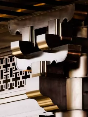 唐代孔穎達(dá)說(shuō):“山節(jié),謂刻柱頭為斗栱,形如山也。” 有唐一代,斗栱碩大,屋檐深遠(yuǎn),盛唐雄渾的建筑氣象就此定格。廈門(mén)璽樾的斗栱韻味十足,盡錯(cuò)綜之美,顯技巧之變。
