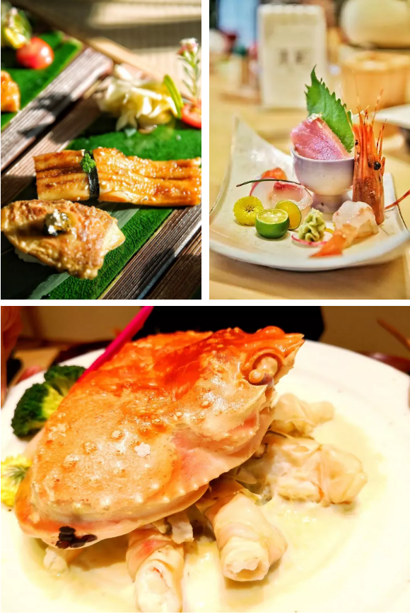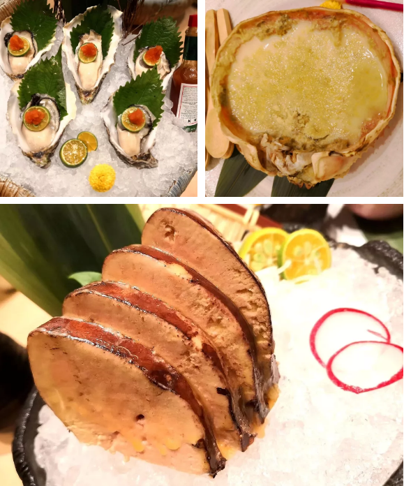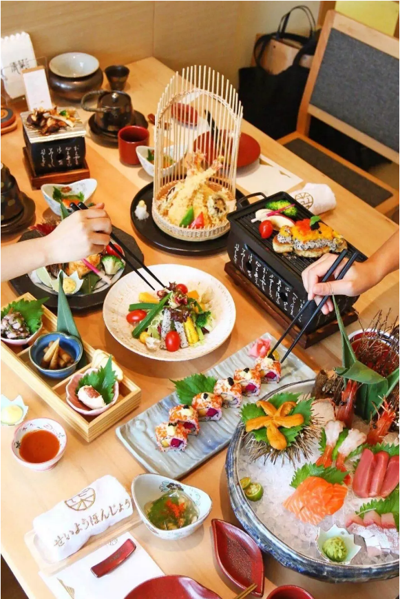 三文魚北極貝刺身雙拼,三文魚厚切大片油脂豐富、北極貝新鮮脆爽;樸葉牛肉,牛肉冒著油花滋滋作響,烤葉子的香氣浸透到肉中,鮮美可口;香煎鵝肝佐鮮果醬,鵝肝煎到金黃酥脆,搭配火龍果和芒果,別有風味;喜歡榴蓮的朋友,可以盡情嘗試一下芝士焗榴蓮,感受榴蓮的香氣四溢、味美不膩。清葉已經成為食客們念念不忘的日料店。