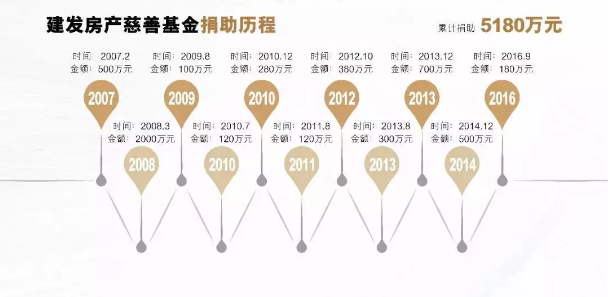 2007年,建發房產慈善基金成立,秉承"有愛就有路"的理念,目前已累計向該基金捐贈了5180萬元,資助貧困大學生超過5500人,資助貧困家庭超過2500戶,希望為每一個有夢想的奮斗者插上翱翔的翅膀。除此之外,在2008年四川汶川地震、2010年青海玉樹地震及2013年四川雅安地震后,向災區捐款總計2300多萬元,積極投身災后重建工作。