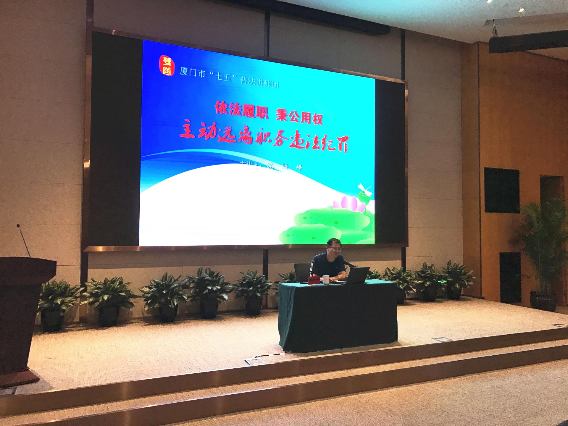 本次講座由廈門市紀委宣傳部副部長沈培峰主講,沈部長以“依法履職,秉公用權——主動遠離職務違法犯罪”為題,從反腐敗查辦案件基本情況、分領域政治精準反腐啟示、職務違法犯罪的預防建議等方面,結合實際案例,對職務犯罪造成的危害進行深刻剖析。沈部長認為,遠離職務犯罪要以案為鑒,謹記犯罪風險;抓早抓小,注重防微杜漸;排查風險,突出預防重點。